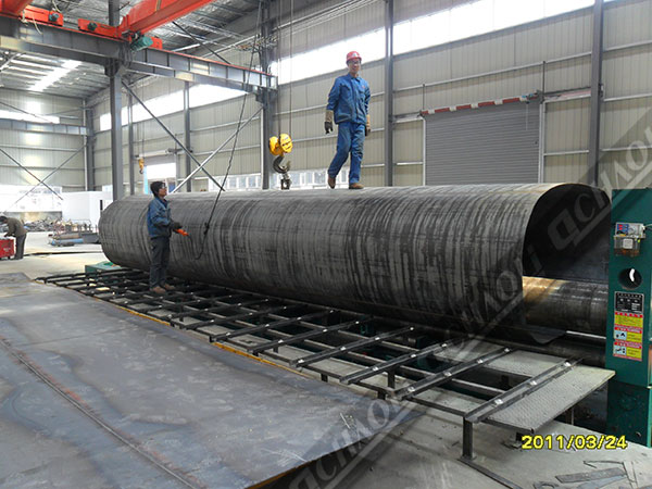 掛車用卷板機(jī)增加托輥及上輥撓曲補(bǔ)償可使筒件取得較好的直線度。可增加外托料架及內(nèi)升料架使操作更便利,更少人工??膳浜锨昂蟮拦ば蜃魃a(chǎn)線優(yōu)化使用。